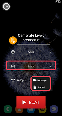 - Kamera: mengaktifkan kamera depan(selfie) di siaran langsung anda